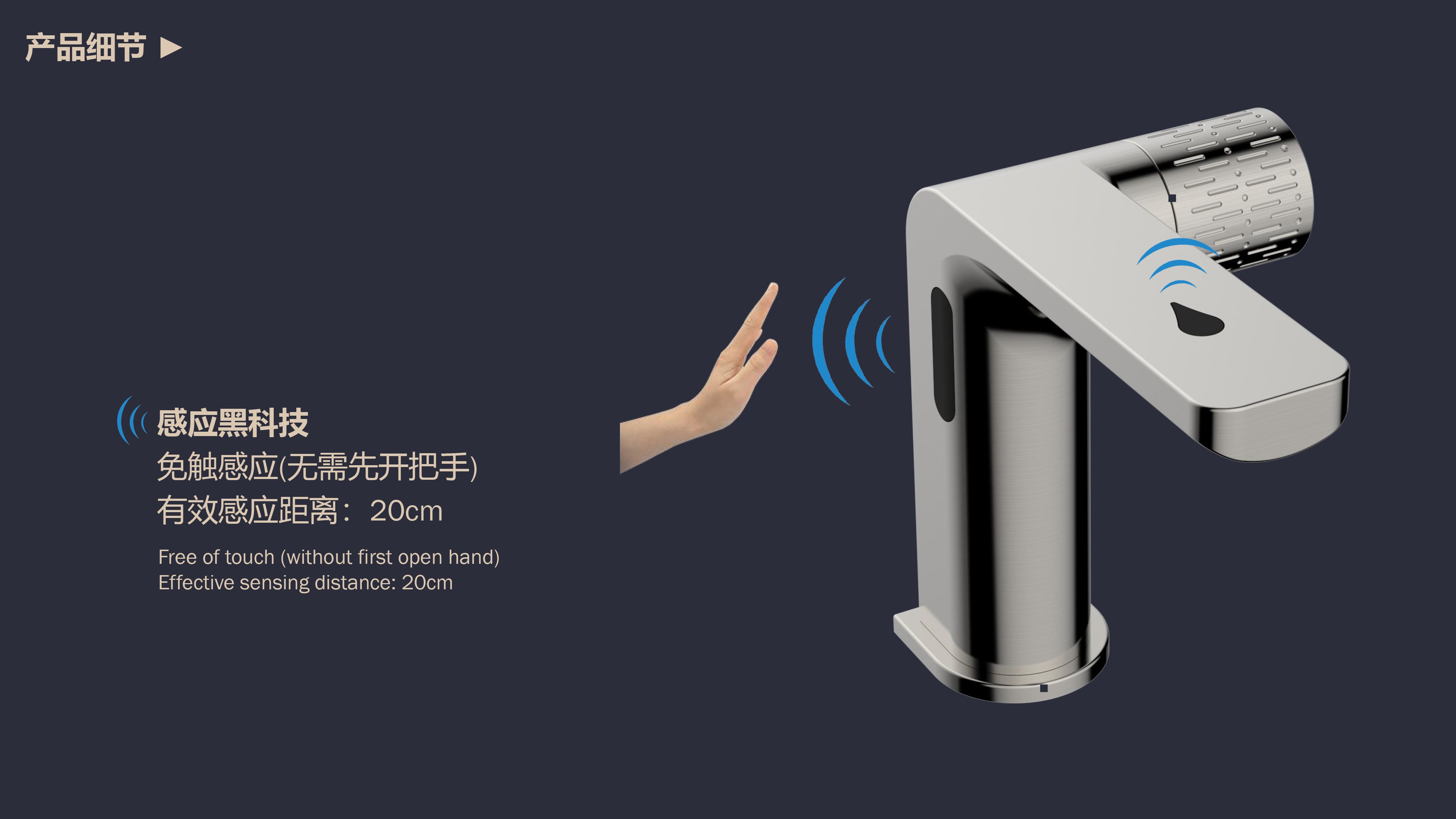 0接觸更健康,感應給皂雙控龍頭;有效感應距離20cm;智能芯片恒溫專利技術;氣泡水觸感細膩不飛濺